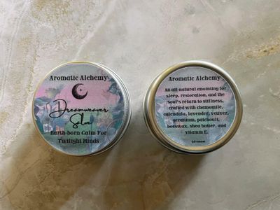 In the quiet hush between dusk and moonrise, a salve was born from the earth’s gentlest healers. This blend weaves together ancient herbs known for their soothing touch - chamomile, calendula, and lavender, each harvested to soften the edge of day. Infused with the grounding energies of vetiver and patchouli, and brightened by the floral breath of geranium, this balm carries the hush of forest dreams and the warmth of hearth light. Smoothed over the skin, it calls the spirit inward, quieting the mind, settling the breath, and steeping the senses in peace. An anointing for sleep, for restoration, and for the soul's gentle return to stillness.